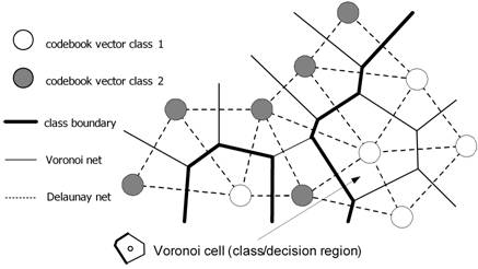 Learning means modifying the weights in accordance with adapting rules and, therefore, changing the position of a CV in the input space. Since class boundaries are built piecewise-linearly as segments of the mid-planes between CVs of neighbouring classes, the class boundaries are adjusted during the learning process. The tessellation induced by the set of CVs is optimal if all data within one cell indeed belong to the same class. Classification after learning is based on a presented sample’s vicinity to the CVs: the classifier assigns the same class label to all samples that fall into the same tessellation – the label of the cell’s prototype (the CV nearest to the sample).