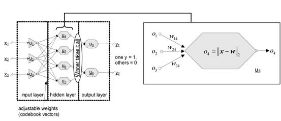 In terms of neural networks a LVQ is a feedforward net with one hidden layer of neurons, fully connected with the input layer. A CV can be seen as a hidden neuron (‘Kohonen neuron’) or a weight vector of the weights between all input neurons and the regarded Kohonen neuron respectively (see Fig.5).