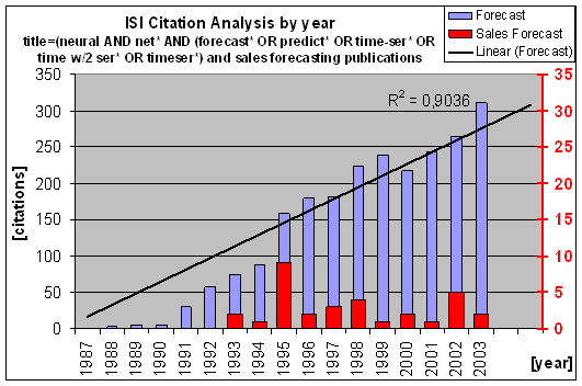 A variety of Literature reviews on business applications of ANNs have been published . Following Adya and Collopy’s survey and evaluation  we conduct a citation analysis at the ISI web of science (review conducted 04/2004) . Our keyword search for neural networks in forecasting yielded 2568 publications, demonstrating an unabated interest an continuous increase of publications on theoretical developments and practical applications since 1988 in a wide range of disciplines, including weather, biological processes, mathematical series and other non-business applications. Fig.1 gives an overview by year.